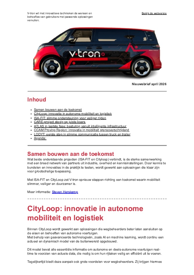NIEUWS, SOCIALS & PODCASTS ABONNEREN OP NIEUWSBRIEF Onze meest recente nieuwsbrieven April 2026 Maart 2026 Februari 2026 Onze recente social feeds WIM VOSSEBELT TE GAST BIJ ... : PODCASTS OVER DE TOEKOMST VAN AUTONOOM RIJDEN V-TRON OVER ISA ( INTELLEGIENT SPEED ASSISTIANCE) OP BNR NIEUWSRADIO: V-TRON TE GAST BIJ: TRAFFIC RADIO Geïnteresseerd in onze producten of diensten? Neem contact op